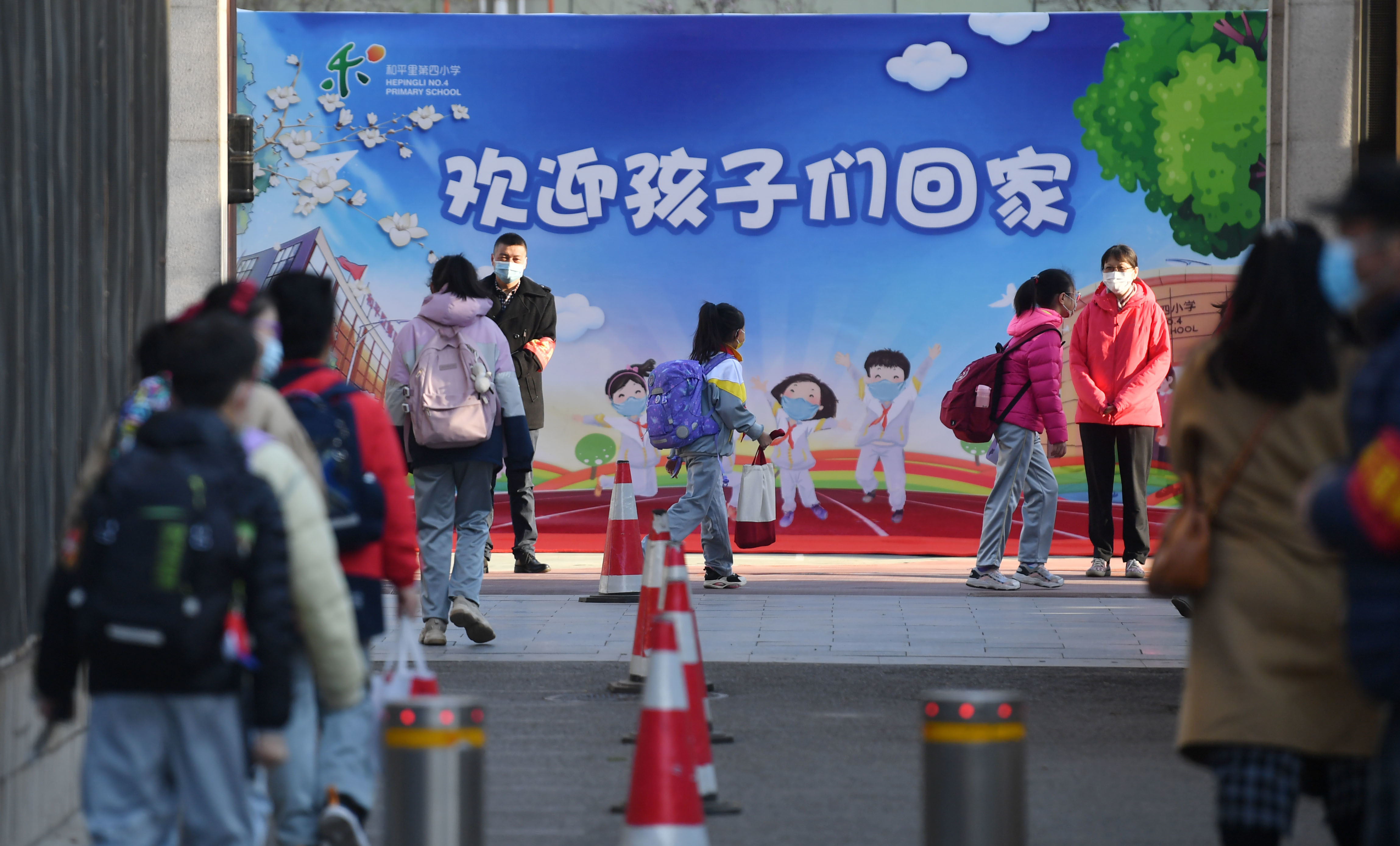“同学们,都靠边儿走。”4月1日早上,沉寂了许久的和平里四小本部校区门口再次热闹起来。学生们沿着通道,在老师的指引下陆续入校,从写着“欢迎孩子们回家”的巨幅展板下经过,回归校园生活。